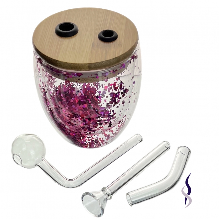 Enjoy a unique and stylish smoking experience with the Glass Cup Water Pipe. It features purple dot accents sealed inside the double-wall cup. By installing a different glass stem on the bamboo lid, it can work as a water sweet puff or a glass bong.